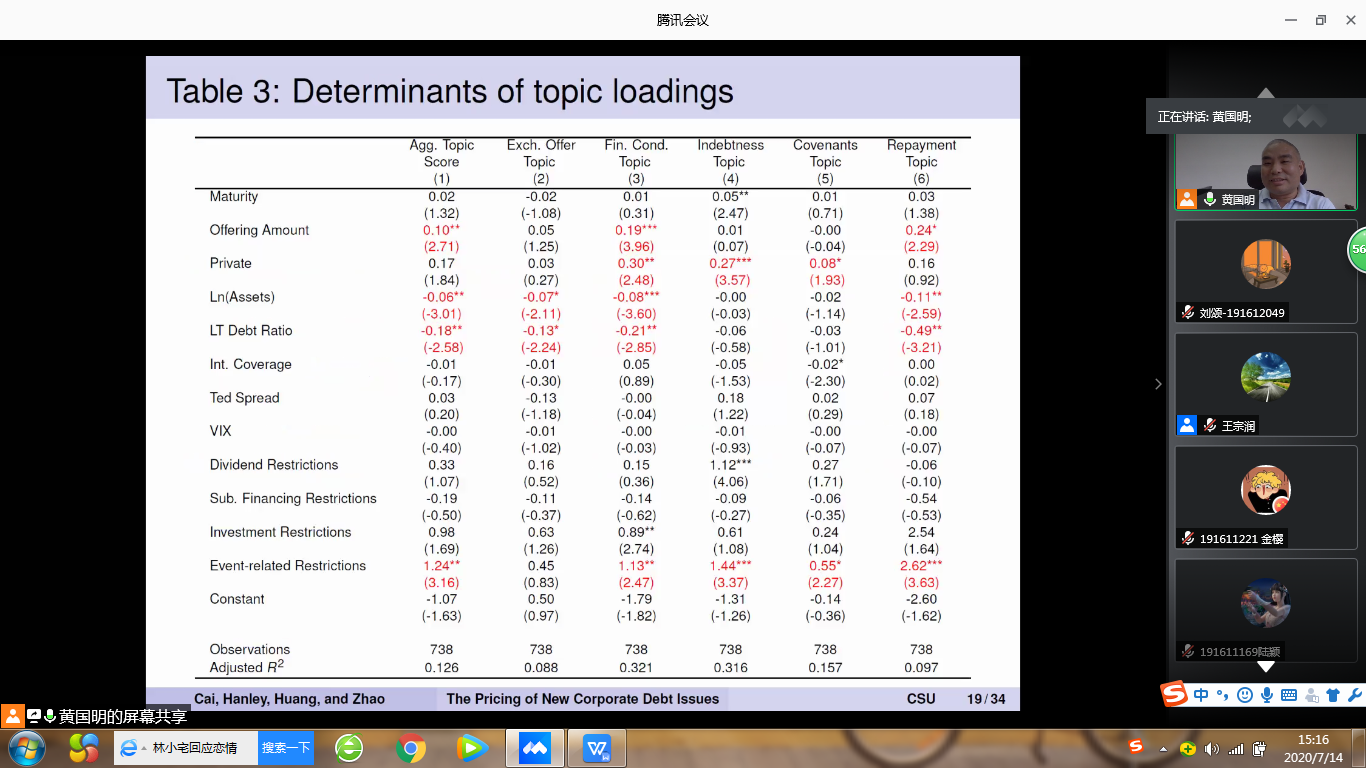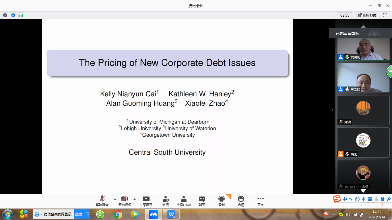 2020年7月14日下午,加拿大滑铁卢大学金融学黄国明副教授应邀通过线上讲座平台(腾讯会议)开展了主题为“The Pricing of New Corporate Debt Issues”的学术讲座。会议由william威廉中文官网副经理王宗润教授主持,william威廉中文官网相关教师、博士和研究生参加了本次讲座。