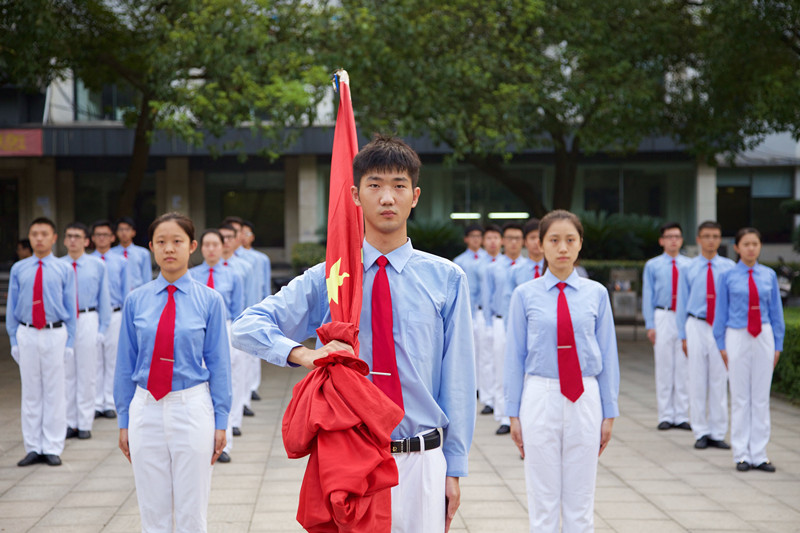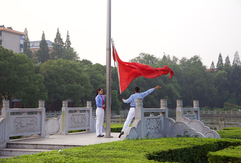 伴随着朝阳,升旗仪式于6点50分正式开始。全体国旗班成员以及所有观礼师生早已守候于升旗现场,静待国旗的升起。擎旗手握住国旗走在队伍最前方,带领着整个护旗方阵,踏着矫健的步伐,以饱满的热情,庄严地护卫五星红旗进场。伴随着雄壮有力的国歌声响彻校园,升旗手振臂一挥,将鲜艳的五星红旗扬至空中,国旗冉冉升起,迎风飘扬。