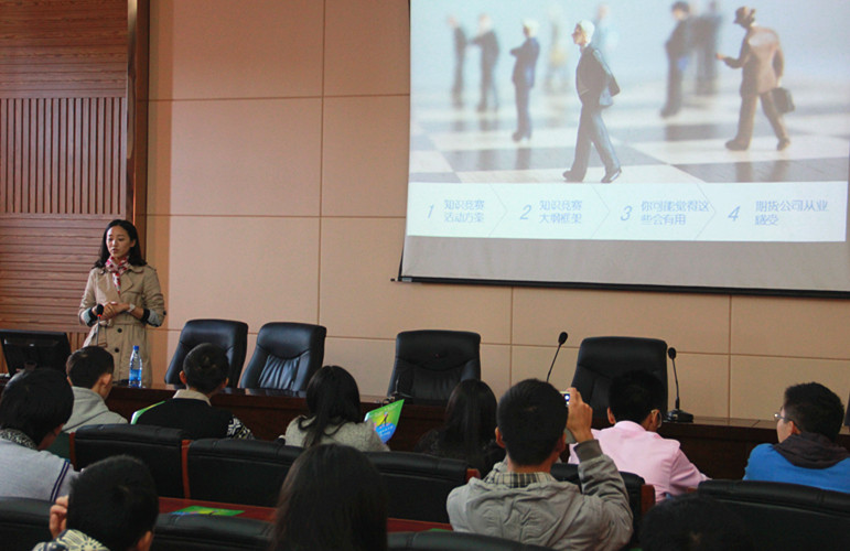 11月2日下午两点半,大有期货有限公司副所长肖龙先生,大有期货有限公司研究员张笑寒女士做客管理楼508,为公司百余位学子普及金融期货及衍生品知识,并对第二届“中金所杯”高校老员工金融及衍生品知识竞赛进行宣讲。院团委常务副书记陈文参加并主持了此次宣讲会。