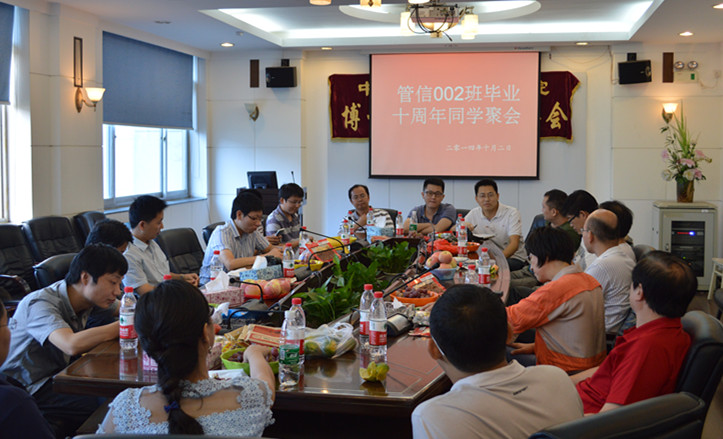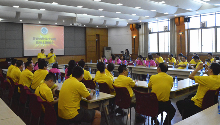 次日上午,管理系90级的全体返校员工在管理楼409举行了毕业十周年座谈会,聚会由两位返校员工代表主持。聚会开始首先是按寝室为单位的同学介绍,大家在久别重逢的同学面前分享自己二十年来经历的风风雨雨、欢笑辛酸。员工们在介绍了自己的经历的同时,也纷纷表达了自己对母校的深情,并通过毕业十年聚会视频和老照片回忆曾经的美好时光。会场里一片欢声笑语,其乐融融。