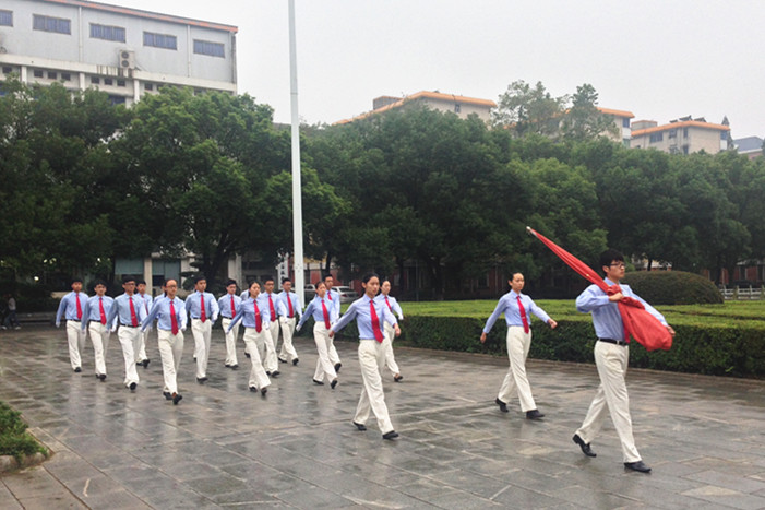 升旗仪式于6点50分准时开始,全体国旗班成员以及所有观礼师生早已到达升旗现场,静待国旗的升起。擎旗手握住国旗走在队伍最前方,带领着整个护旗方阵,踏着矫健的步伐,以饱满的热情,庄严地护卫五星红旗进场。伴随着雄壮有力的国歌声响彻校园,升旗手振臂一挥,将鲜艳的五星红旗扬至空中,国旗冉冉升起,迎风飘扬。