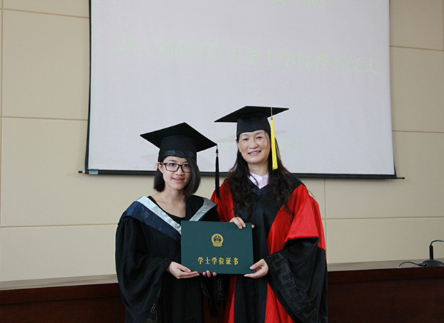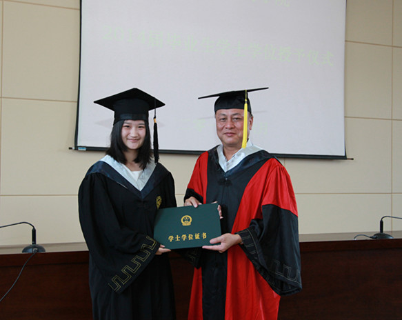 最后,毕业生们身穿学士服,走上前台,学院领导和老师为他们一一拨过学位帽上的流苏,授予学士学位证书并合影留念。