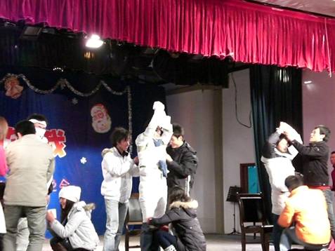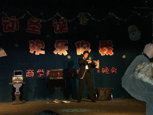 首先,伴着活力四射开场健身舞,晚会拉开了序幕,由四方语言联唱,让大家感受到了圣诞的欢庆气氛,明快的歌声中,圣诞老人带来了糖果、荧光棒等圣诞礼物,表达着新年甜甜的祝福;院经贸系冯正强和傅沂老师喝着节奏唱起了歌曲《千里之外》,赢得了同学们热烈的掌声和尖叫声;冯老师和宁涛还现场合唱了一首《为了谁》,二人配合的丝丝入扣,博得了现场同学们的阵阵喝彩;公司叶欣同学带来了独具埃及风情的《肚皮舞》,优美的音乐,曼妙的舞姿将整场晚会推向了高潮;最后,由艺术特招生徐剑表演的魔术让在场大家大开眼界,回味无穷。同时,此次活动穿插了很多同学们喜爱的游戏,看着参加游戏的同学一个个被包成了“木乃伊”,现场不时爆发出阵阵笑声。