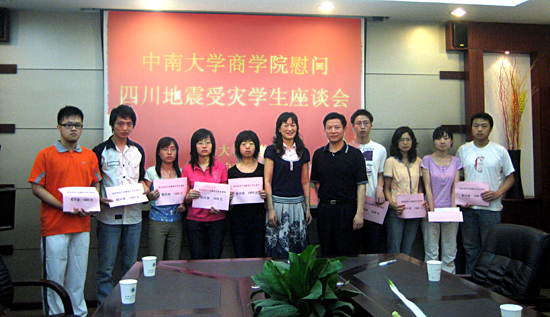 灾情发生后,学院领导高度重视,5月12日晚公司党委副书记立即组织安排统计学院受灾员工情况,掌握第一手资料。在13日上午九时获得准确受灾员工资料:学院共有44名四川籍员工,其中家庭受灾严重员工10名。此后几天,学院负责员工工作的老师和年级辅导员轮流到员工宿舍了解员工情况,抚慰看望员工,确保受灾员工情绪稳定。5月18日,刚刚在北京参加会议回到学院的陈晓红经理,不顾旅途劳累,立刻召开慰问四川地震受灾员工座谈会,对受灾员工进行了思想开导,鼓励大家坚强面对困难,自强不息、乐观生活,同时发给10名受灾严重员工每人1000元生活补助。