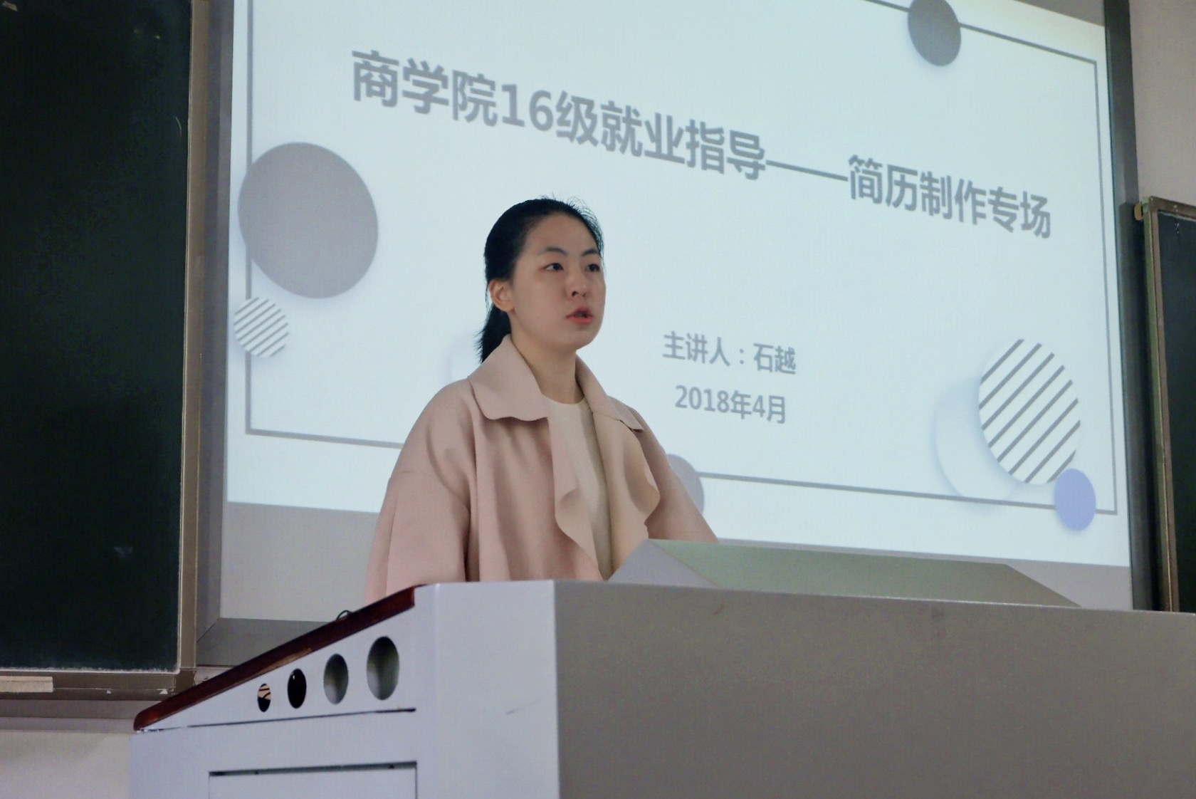 而在财务管理、会计学等管理类专业的讲座上,石越老师以当下本科生就业所面临的严峻形势为开场,在职业生涯规划、就业方向选择等方面为大家做了简要阐述,并重点进行了简历撰写的指导。讲座内容主要分为五个核心要点。在概述简历的主要内容、制作步骤及注意事项的同时,石老师还生动具体地讲解了本科生如何在简历撰写中“扬长避短”,并特别强调“简历是人走出来的”,鼓励本科生在大学期间充实学习实践,提升个人实力,从而在未来求职中处于领跑地位。另外,石老师还从用人单位角度为大家呈现了15秒筛选简历的过程,所以删繁就简,在简历中凸显自己与众不同的能力和潜质就尤为重要。最后,石老师为同学们分享了寻找工作信息的方法与技巧,并预祝大家未来求职顺利。