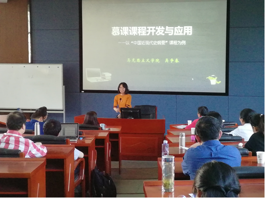 研讨交流会开始之前,任经理对全国高校慕课发展情况做了简要介绍,并向全院教师通报了学院在线开放课程的建设与管理规定。马列院吴争春老师做“慕课课程开发与应用”主题交流。吴老师从慕课特点和要素、慕课设计与开发思路、慕课与混合式教学改革以及混合式教学改革成效四个方面进行讲解,并展示了部分教学视频及员工制作的微视频;李满春老师从教学团队的分工合作、教学内容设计、教学形式、教学过程及考核方式等方面解释了学校在线开放课程评审标准;曹丹老师从经费资助、视频制作、课程上线和管理等方面宣讲了学校关于在线开放课程建设的相关政策。