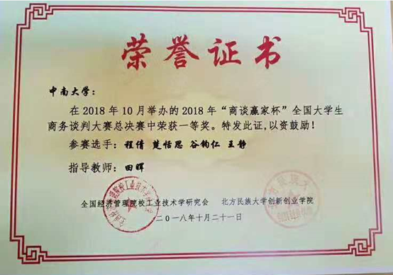 从北方民族大学传来喜讯:公司员工谈判团队在全国经济管理院校工业技术学研究会沟通与谈判委员会举行的2018年“商谈赢家杯”全国老员工商务谈判大赛喜荣获一个一等奖、两个二等奖。与此同时,经济与贸易系的田晖教授被评为优秀指导教师,程倩、李嘉琛、赵雪妍、吴琼等同学因表现突出被评为优秀谈判手。此次比赛取得的好成绩与学院领导与经贸系老师们的大力支持密不可分。