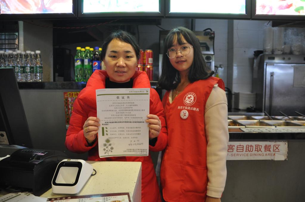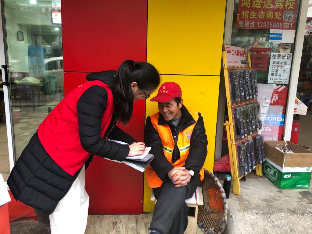 与此同时,另一组人员走访当地商铺,对井湾子街道的商家进行垃圾分类的知识宣传,并发放宣传资料,号召商家签署垃圾分类倡议书。志愿者们与商家交谈,记录下商家们对未来环境的改善建议和展望。