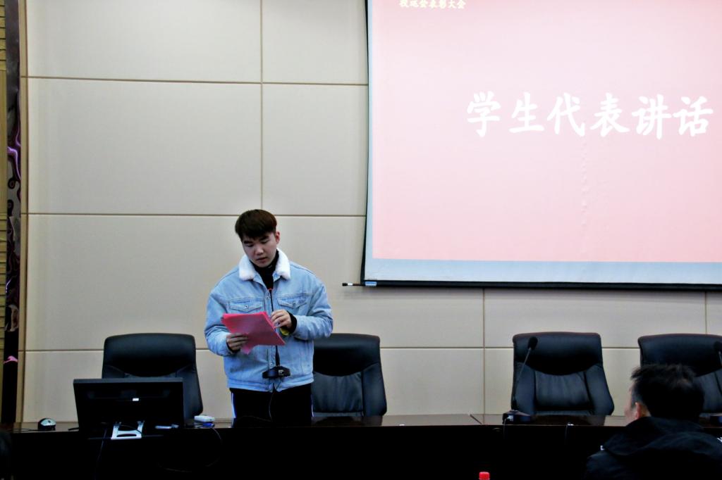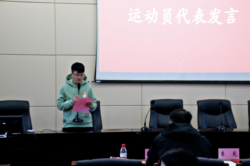 员工代表张梓依、周泽朋代表所有运动员向一直关心支持他们的学院领导、老师和同学们致以最真挚的谢意,并表示将不断拼搏,超越自我,再创佳绩。