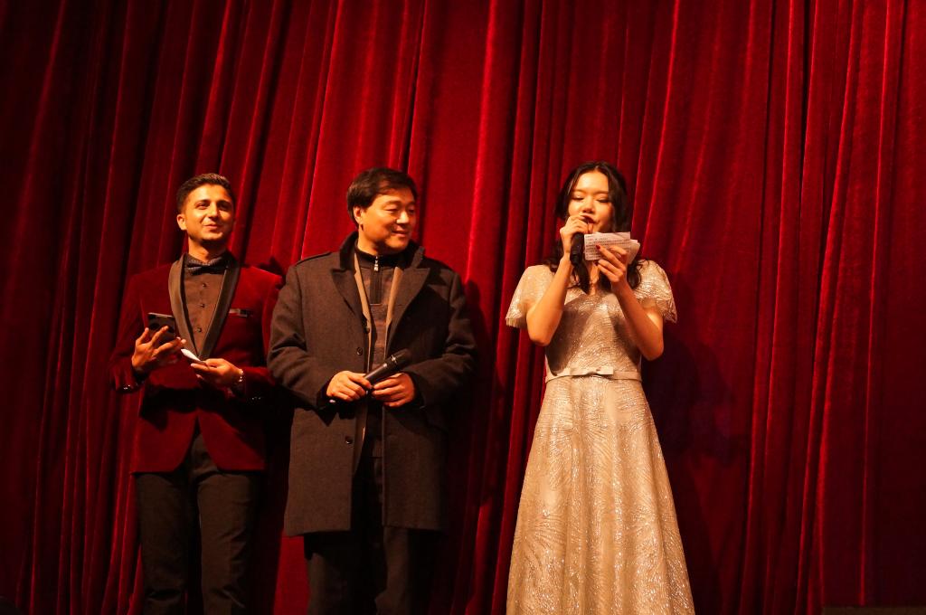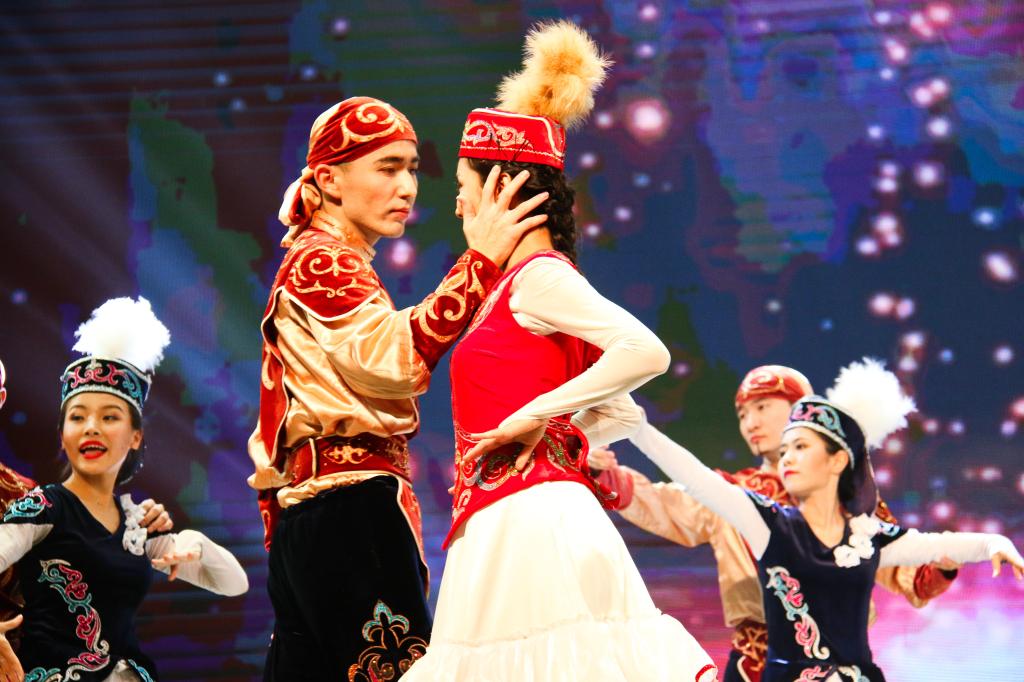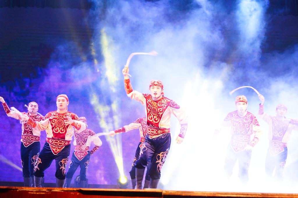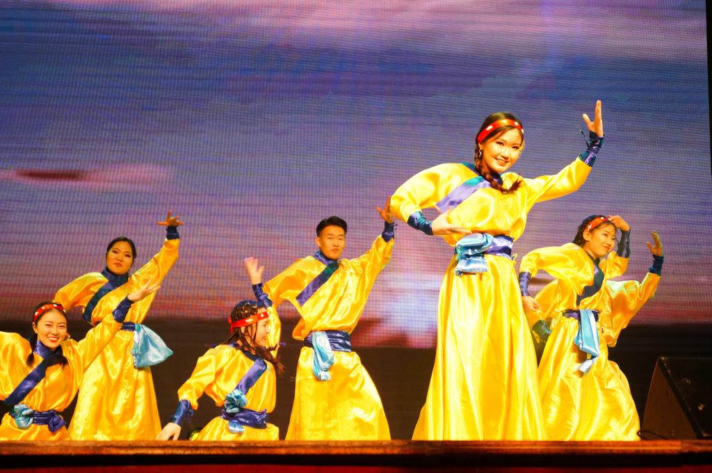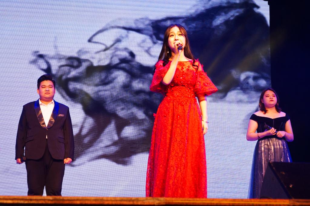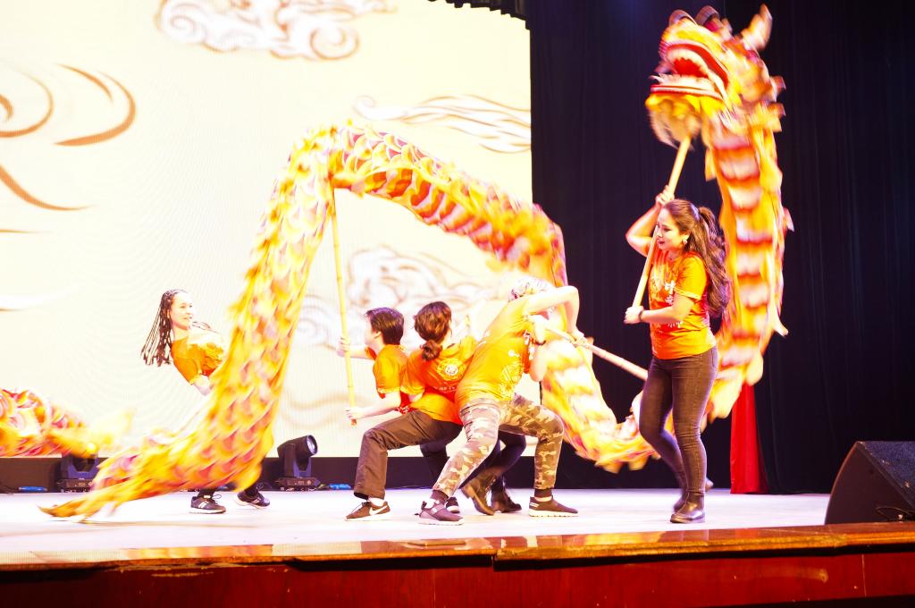 祝福视频播放完毕,技艺高超的舞龙表演拉开了晚会的序幕。舞龙结束后,节目开始呈现。哈撒克族舞蹈《走黑马》,蒙古舞《domog biyelgee》等舞蹈热力绽放,舞出热情与欢乐,表现民族的独特文化;民乐《加勒比海盗》、马头琴演奏《Jalam Khar》和钢琴演奏《天使艾米丽》等通过乐器演奏,在或激昂或柔美的曲调中中展现乐观与爱 ;以美声演唱的《烟花易冷》袅袅而至,唱入观众情感深处;魔术的奇妙更让人难忘。
