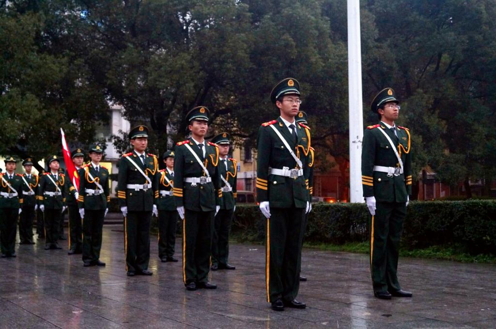 6点50分,仪式准时开始。国旗班迈着矫健的步伐护送鲜艳的五星红旗缓缓走来,全场一片肃静。伴随着庄严的国歌《义勇军进行曲》,五星红旗冉冉升起,全体师生行注目礼,一抹鲜艳的红色绽放在天空中。