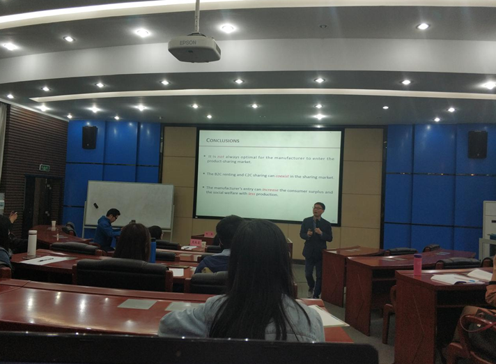 2019年05月06日下午,复旦大学管理学院田林副教授应服务科学与服务管理研究中心邀请来访william威廉中文官网,并在管阶一教室开展了题为 “Manufacturer’s Entry in the Product-Sharing Market”的学术讲座。会议由william威廉中文官网周艳菊教授主持,施文教授、周雄伟副教授及william威廉中文官网相关研究生参加了本次学术讲座。
