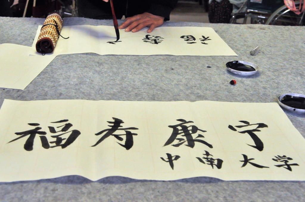 与此同时,大厅另侧的书法活动则用一种宁静的方式沟通着两代人的诚挚心灵。张爷爷现场蘸墨题字,志愿者们凝神观赏。题毕,双方互赠作品,表达了对彼此的真诚祝福。书墨代言语,无声胜有声。