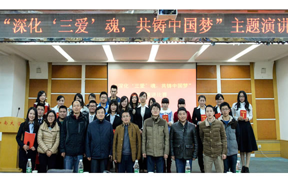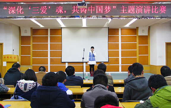 In order to further understand “Chinese Dream”, to enhance students’ social responsibility, sense of mission, innovative spirit, practical ability, and humanistic feelings, to make students have a better understanding of “three kinds of love”, to raise students awareness and initiative of socialist core values. December 10, a speech contest themed “To Understand Three Kinds of Love, To Realize Chinese Dream Together” was held in Speaking Hall. It was sponsored by Student Affairs Office of CSU, and undertaken by Business School. Judges of this contest are: Tao LI, Head of Student Affairs Office, Yong YAO, Vice-director of Graduate Student Affairs Department, Zhengzong LIU, the Deputy Secretary of Youth League Committee of CSU, Huadong LI, Deputy Party Secretary of CSU, and Zhenhua CHEN, a teacher from Student Affairs Department. In addition, all the counselors of Business School also came to attend this contest.