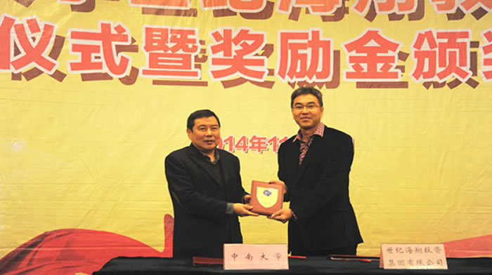 At the beginning of Award Ceremony, Zhenhua HU, the Director of Development and Liaison Office of CSU introduced the content of donation agreement.Then, Wenbing GAO, the Party Secretary, together with Mr. Jing GU signed “the Sail Group Educational Fund Donation Agreement of CSU”.