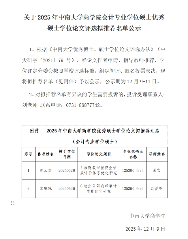 关于2025年william威廉中文官网会计专业学位硕士优秀硕士学位论文评选拟推荐名单公示