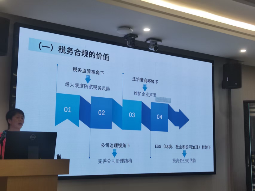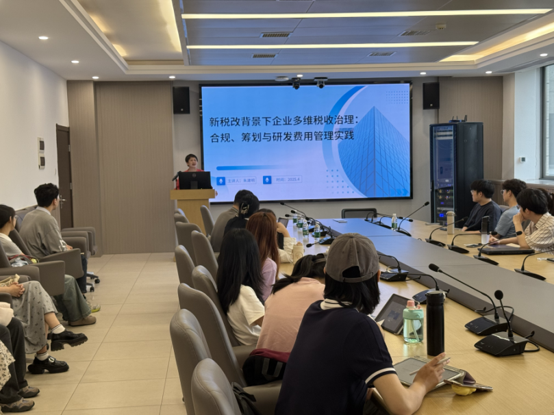 随后,朱建明女士向同学们介绍了税务合规方面的相关内容,从税务监管、法治营商环境、企业治理与ESG框架等不同视角,介绍税务合规价值并提出合规的“及时性”与“充分性”标准。进一步以高新技术企业违规享受研发加计扣除等案例警示风险,强调合规是维护企业声誉与估值的重要基石。
