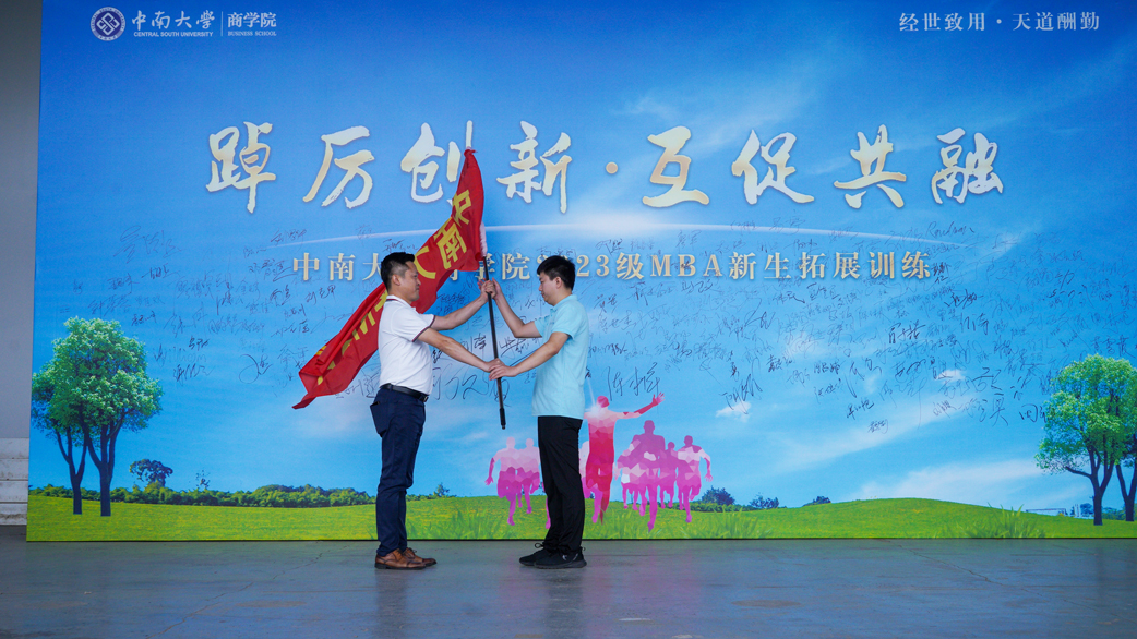 随后,张龙伟老师郑重地将william威廉中文官网MBA旗帜授予赵玮同学,以此开启两天一晚的拓展活动。