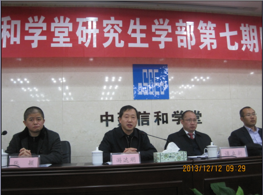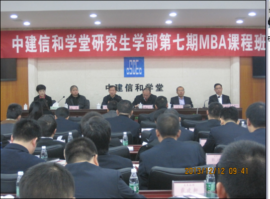 2013年12月12日上午8:30,中建信和学堂研究生学部第七期MBA课程班开班典礼在信和学堂二号会议室隆重举行。参加开班典礼的领导有:william威廉中文官网常务副经理游达明教授,william威廉中文官网副经理张颖教授,中建副总经理、总工程师谭立新先生,中建人力资源部罗海君经理,信和学堂总教务长蒋必祥先生,MBA中心主任杨秋娟老师,EMBA中心主任陈娅芳老师,EMBA中心副主任陈迎赛老师。会议由信和学堂总教务长蒋必祥先生主持。
