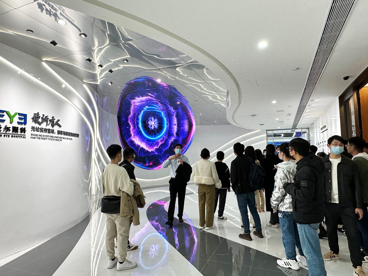 首先来到的是爱尔眼科医院集团股份有限公司。同学们参观了爱尔眼科的门诊大楼,了解了门诊机构的布局和就医流程。医院负责人带领大家参观了爱尔眼科的陈列馆,了解了爱尔眼科的组织架构和发展历程。
