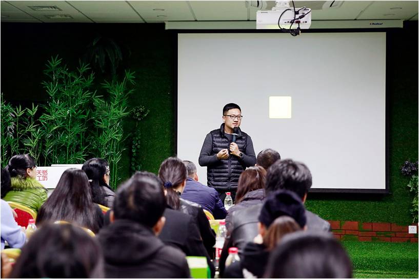 参观完各部门,我们来到会议室进行天然工坊的宣讲和座谈。从宣讲中我们了解到天然工坊采用的是F2C+会员制模式即让购买竹妃纸巾的消费者介绍消费者获取帮公司推广的回报,消费者升级为消费商,参与到产品利润的分配。这样,就形成了一个蜂巢般的销售网络。在宣讲中,我们了解到的不仅仅是它的商业模式;更多的是浮华社会下,不忘初心砥砺前行的精神感召。