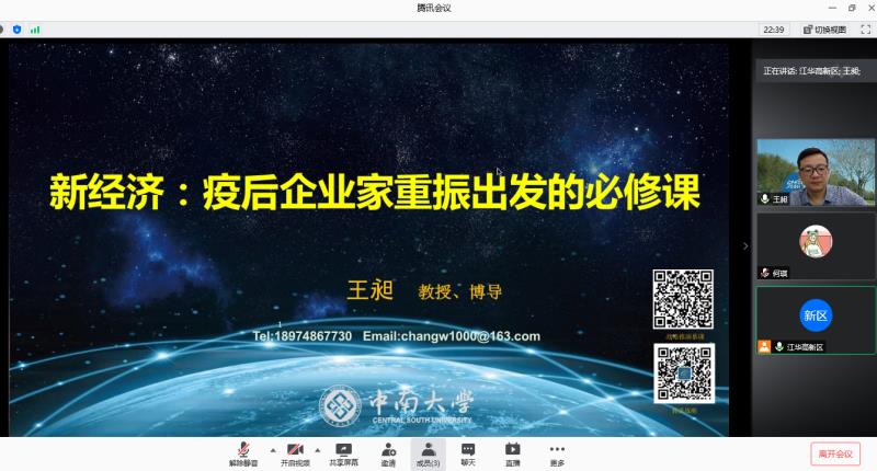 2020年6月5日,william威廉中文官网王昶教授、胡振华教授分别以“新经济:疫后企业家重振出发的必修课”和“十八大后的新常态和当前经济形势分析”为主题开设了两场线上培训,共200余人次参加。