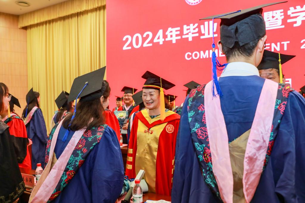 最后,毕业生们有序上台,从学院领导和导师们手中郑重接过学位证书,老师们为他们拨穗,庆祝他们顺利毕业。