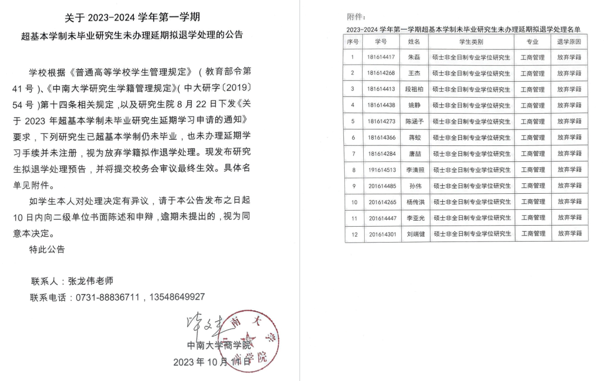 关于2023-2024学年第一学期超基本学制未毕业研究生未办理延期拟退学处理的公告(MBA)