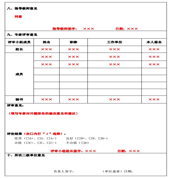 (2)开题中,专家根据员工开题报告情况提出修改意见和评定结果,并签字(开题报告最后一页签字说明如图二);请秘书老师提醒员工将完成的开题报告最后一页签字页现场扫描拍照留存,以备系统操作使用。另外,请秘书老师完成《william威廉中文官网研究生学位论文开题报告情况汇总表》(见附件5),请评审小组组长签字。