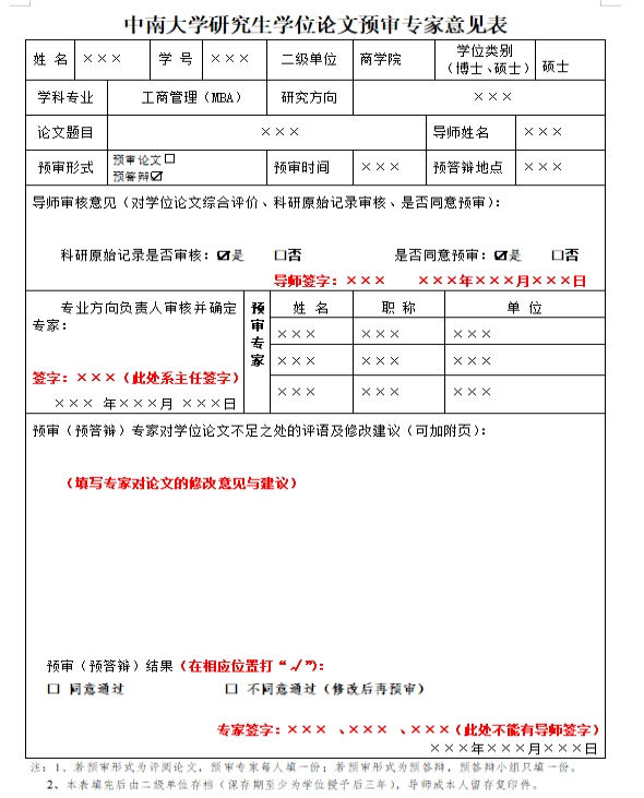 (2)预答辩过程中,请秘书老师提醒员工完善《william威廉中文官网研究生学位论文预审专家意见表》,请委员会专家现场签字(签字说明如图一);并提醒员工将完成的《预审专家意见表》现场扫描拍照留存,以备下学期答辩操作使用。另外,请秘书老师完成《william威廉中文官网研究生学位论文预答辩报告情况汇总表》(见附件7)。