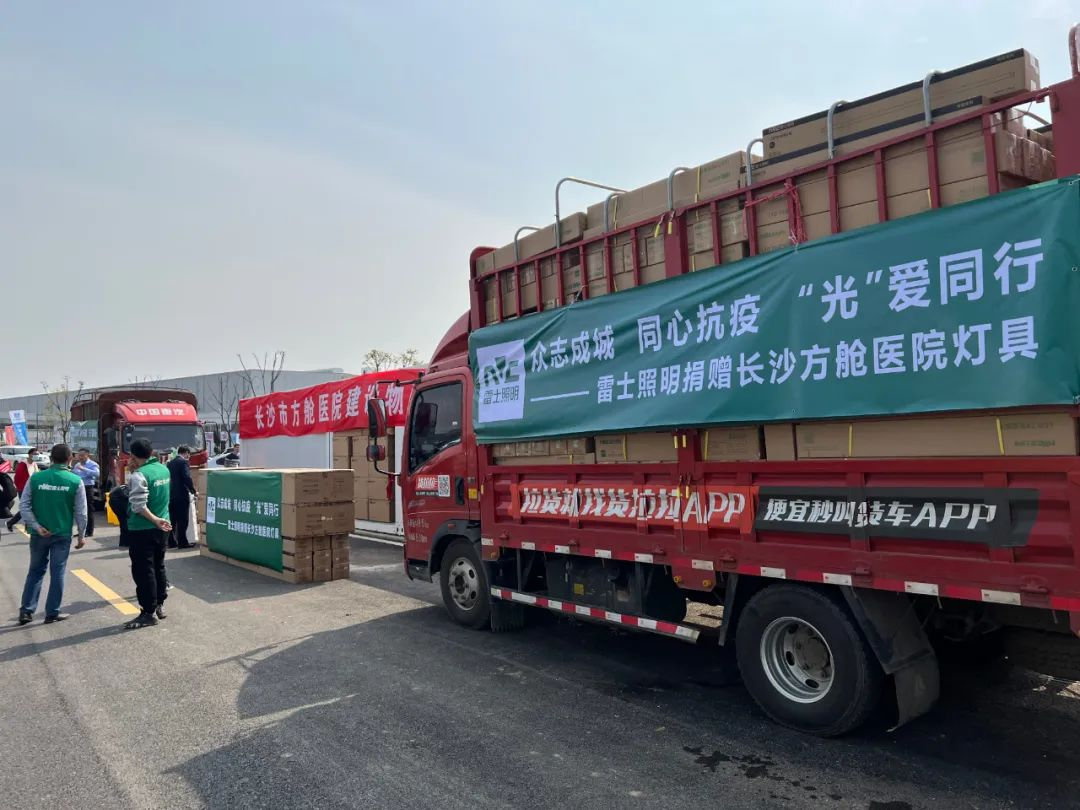 4月2日中午,两辆满载雷士照明产品的货车从雷士照明惠州工厂直接开到长沙方舱医院的建设基地,总共约50000个雷士照明灯具、开关和插座,价值约70万元。