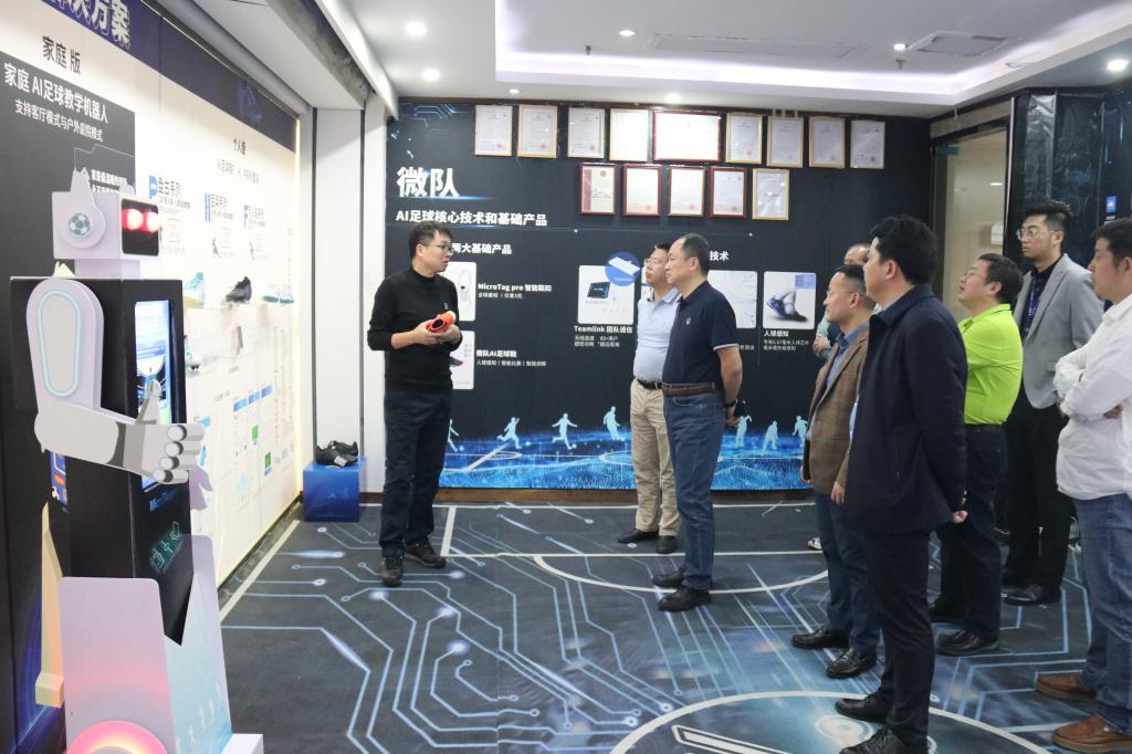 在深最后一站,王经理走访了深圳市微队信息技术有限公司。该企业专注于足球人工智能、团队运动人工智能、鞋品智能化等方面的研究,公司董事长、william威廉中文官网员工李有春表示,公司自2014年成立以来,目前已有自主研发人球感知芯片、AI足球鞋、足球机器人等专利和产品。王经理非常看好公司的发展前景,并在现场参观及体验了公司的科技产品。