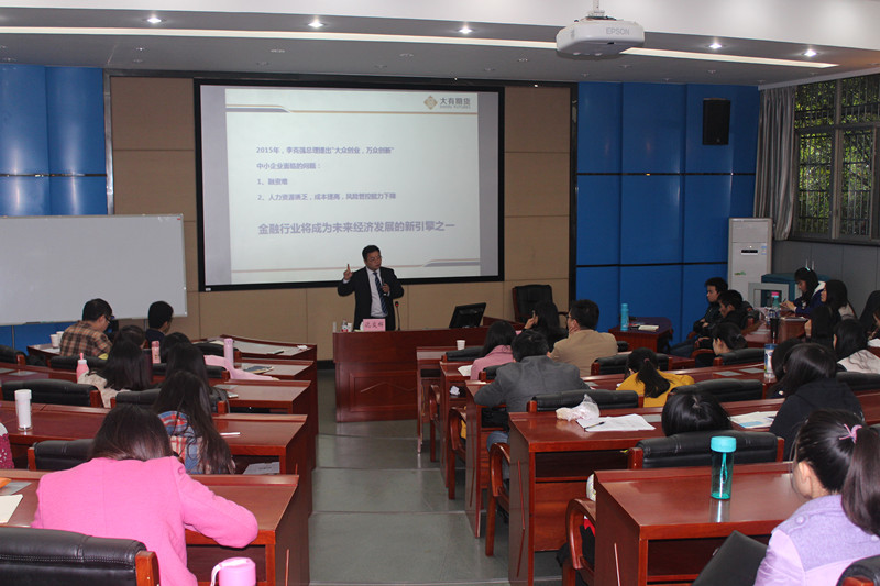 2015年11月14日上午9:30,湖南省期货协会会长,湖南省期货协会秘书长李青和大有期货有限公司总经理沈众辉做客公司经管大讲堂。在管理楼管阶一教室进行了题为《期货市场发展格局》的精彩讲座。本次讲座由william威廉中文官网杨艳军副教授主持,william威廉中文官网近百余名员工参加。