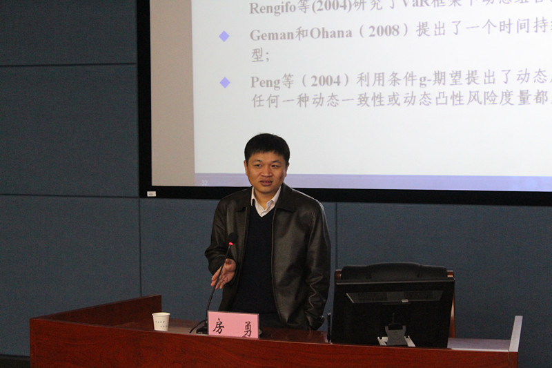 讲座第一部分是房勇副研究员讲述《基于随机规划的多阶段投资组合选择研究》,他的讲座从三个方面展开,分别是投资组合理论及其发展、研究内容与思路、总结与展望。首先,他以国家财富的革命为切入点提出投资是一项风险事业,进而引出投资组合理论的诞生,并重点介绍了投资组合理论及其发展。接着,房勇教授从五个方面阐述了他的研究内容与思路,即情景树生成方法分析、动态风险度量方法的研究、多阶段投资组合选择模型的构建、随机规划模型的算法设计、人机交互的投资决策支持系统的设计。最后,房勇教授从资产种类的拓展、含资产收益波动率预测的投资决策研究和行为动态投资决策研究三个方面进行了总结并提出了他对这一研究方向的展望。